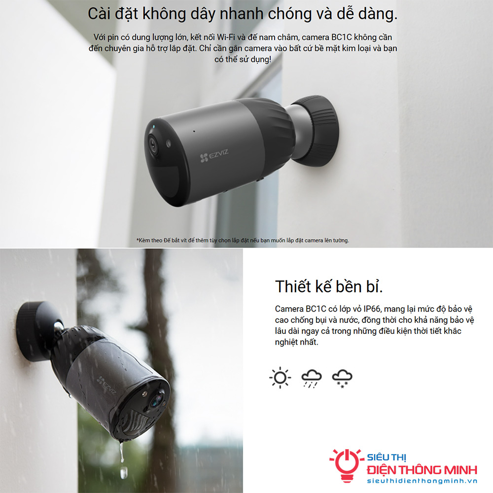 Camera EZVIZ BC1C 2MP (Dùng PIN, Wifi 2MP ngoài trời, loa + mic, đêm có màu, báo động)