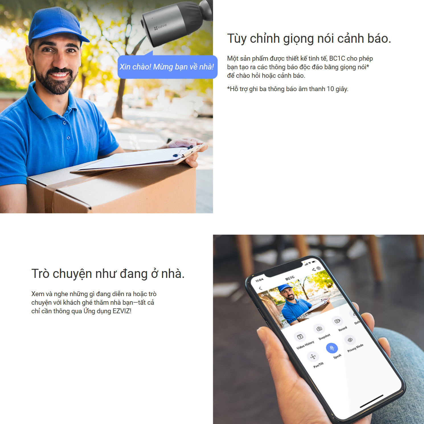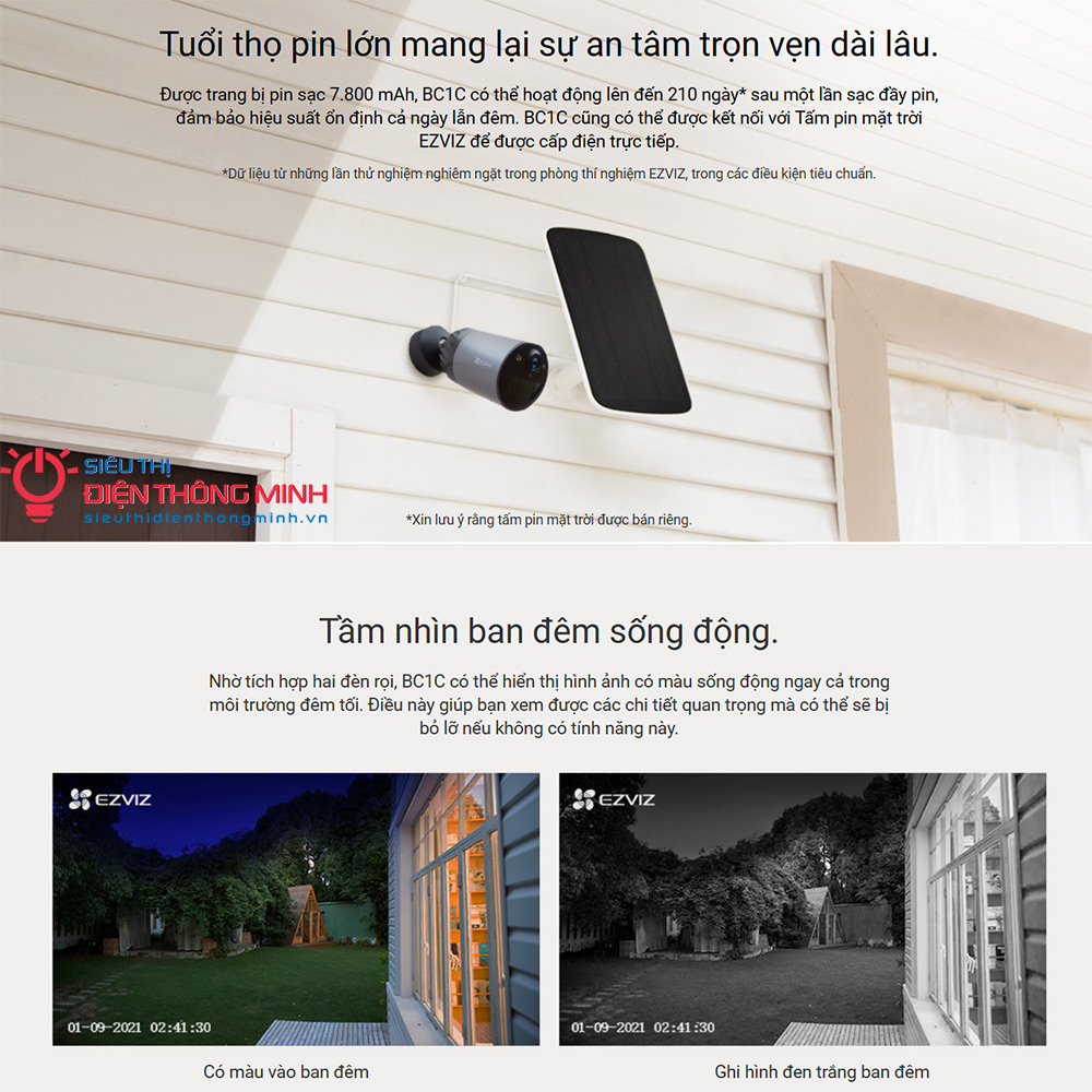 - Có thể hoạt động 210 ngày khi sạc đầy pin (Có thể kết hợp với tấm pin mặt trời Ezviz để sạc trực tiếp)